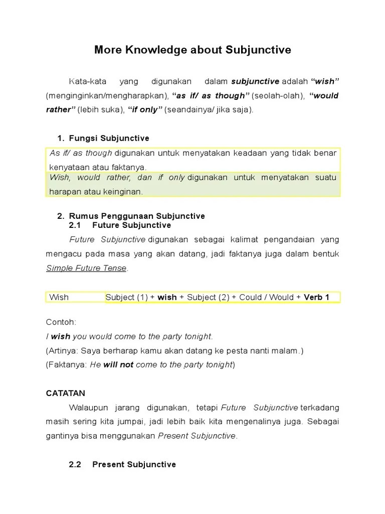 Artikel ini membahas tentang pengertian, fungsi, rumus, penggunaan dan contoh kalimat subjunctive dalam present tense, past tense dan future .